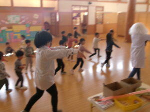 本日、10月生まれの誕生会を行いました。今月は大きいお友達から小さいお友達がおり、みんなで楽しくお祝いしました。お楽しみでも職員の実験ショーともうすぐハロウィンということで、ハロウィンのダンスをしました。