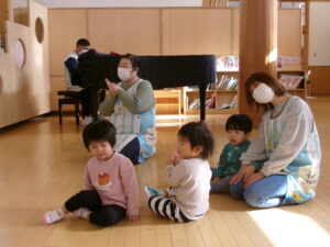 講師に管理栄養士の長倉佳慧先生をお招きし、食事についての育児講座が行われました。講話では、感染症が流行しやすい寒い冬に備え、免疫力がアップする食材や体があたたまるポカポカメニューなどを紹介していただきました。また、小松菜やパプリカ、サツマイモなどの食材に触れたり、匂いを嗅いだり、舐めてみたり(笑)したあと、野菜スタンプをして遊びましたよ♪ママには野菜スタンプでポストカード作りを楽しんでもらいました。ちょっぴり野菜と仲良くなれたかな? なんでもよく食べて、風邪に負けない元気な体を作りましょう!!