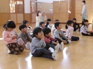 本日、来年度小学校へ入学する5歳児が津山小学校の一年生と交流会の為、津山小学校へ行ってきました。学校の中を一緒に探検したり、体育館で転がしドッチボールや氷鬼しました。教室に戻ってから授業を見学し、一年生に教えてもらいながら自分の名前を書いたり、ひらがなの音読をしたりしました。今日の交流会で、小学校への期待が大きく膨らんだ5歳児さんたちです。