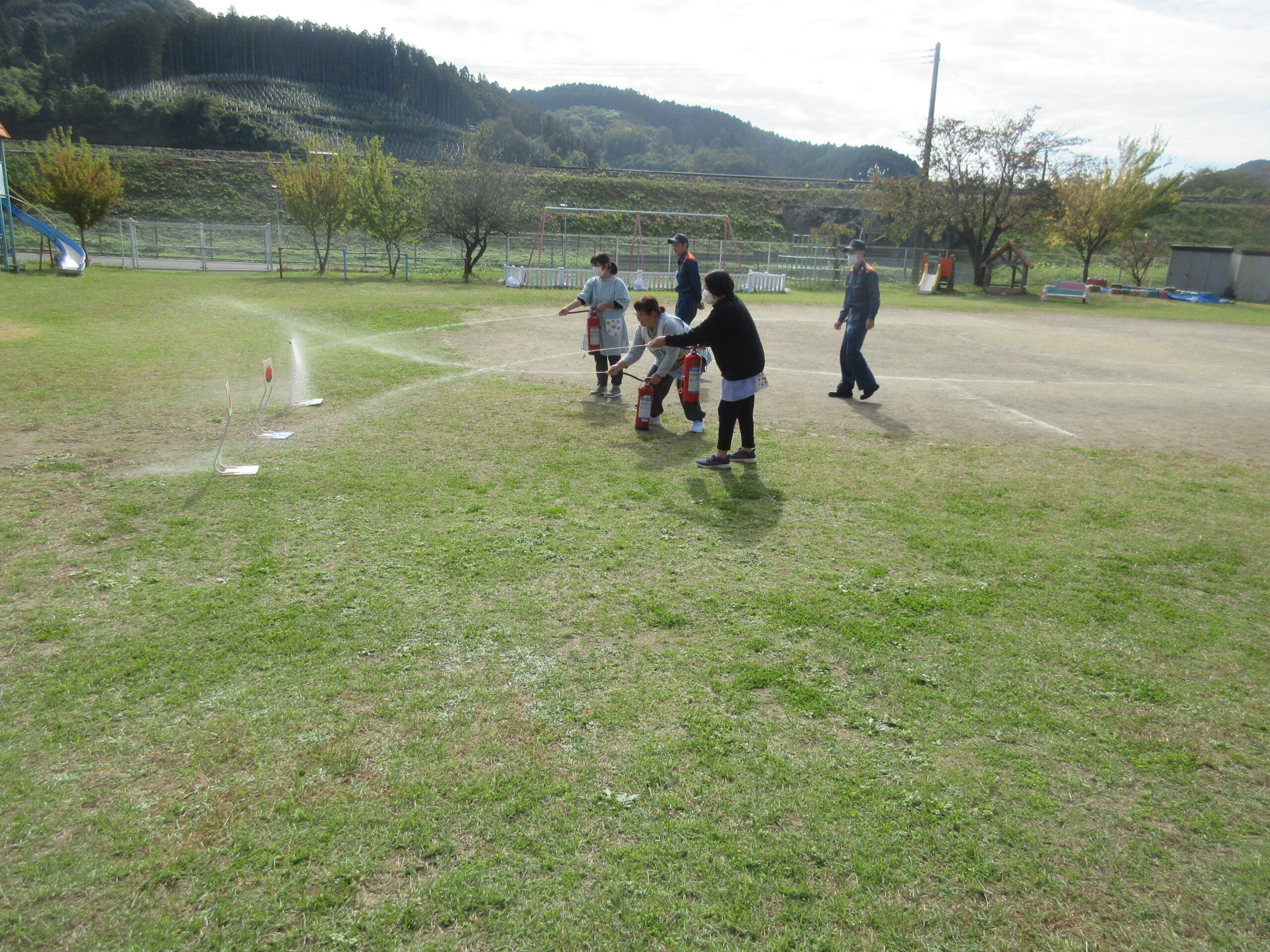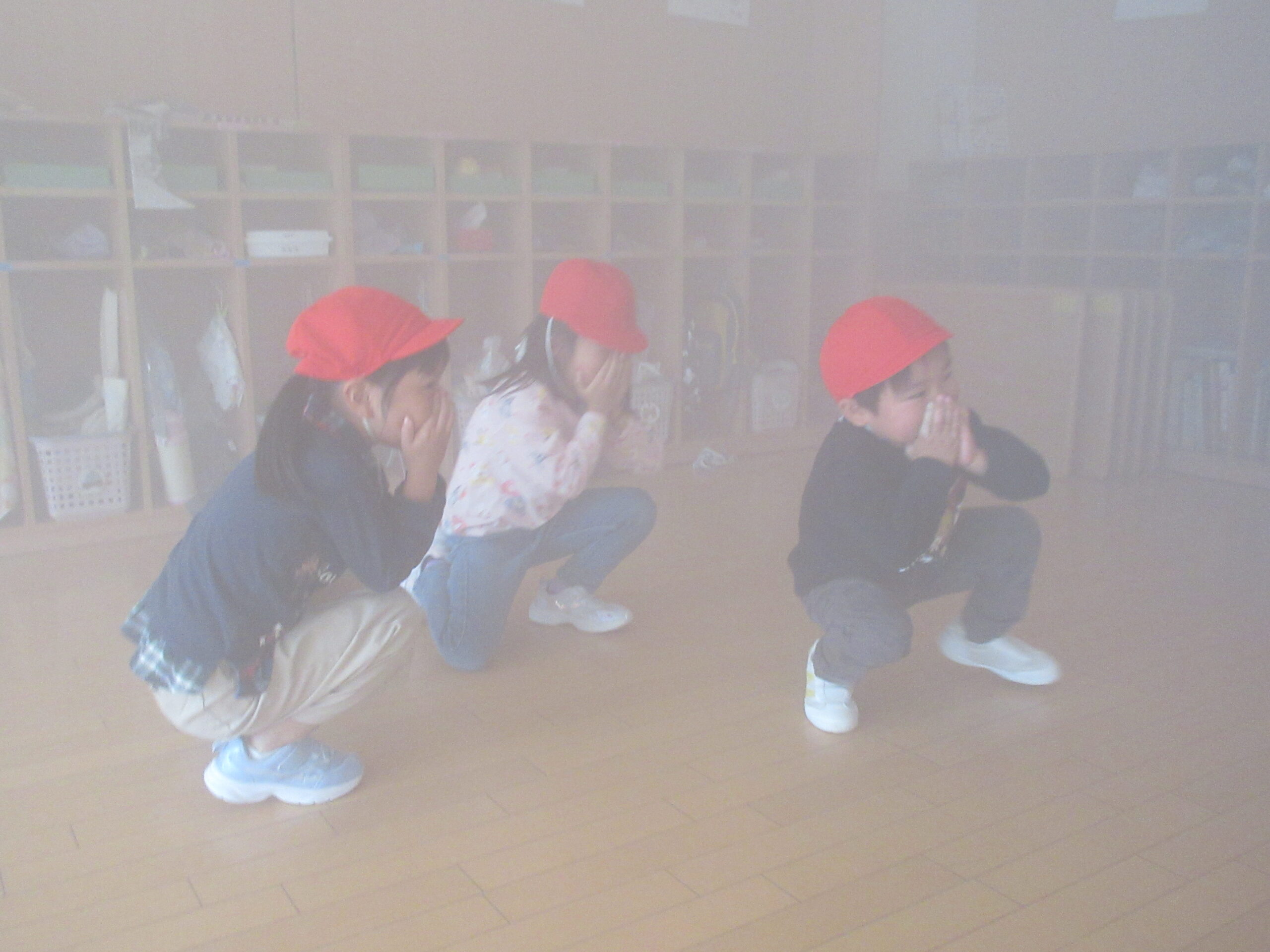 本日、登米市消防署津山出張所の職員の方に来園していただき、避難訓練と幼年消防クラブの防火のつどいを実施しました。訓練では火災を想定して、歩いて近くの空き地まで避難し、職員による消火器を使った消火訓練を行いました。防火のつどいでは、4・5歳児を対象に放水体験や煙体験をしました。ちびっこ消防士になってとってもかっこよかったです。最後は消防車と記念写真を撮りました。津山出張所の職員の皆様、ありがとうございました。