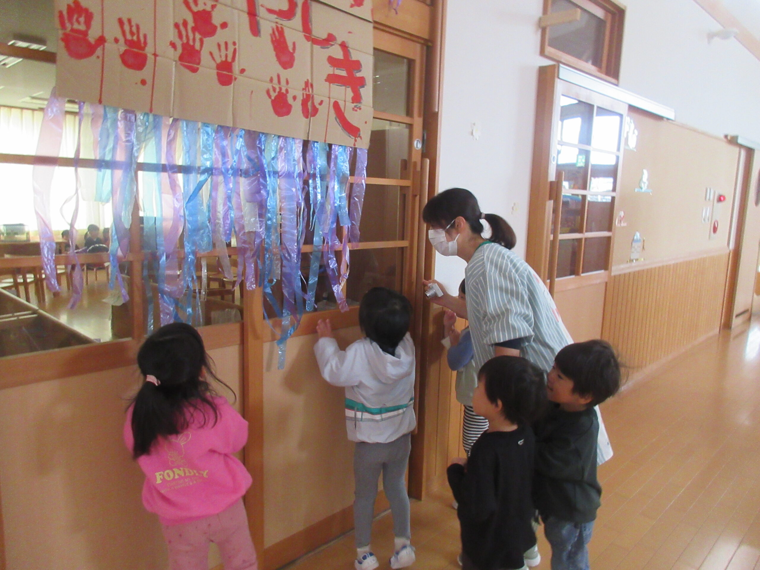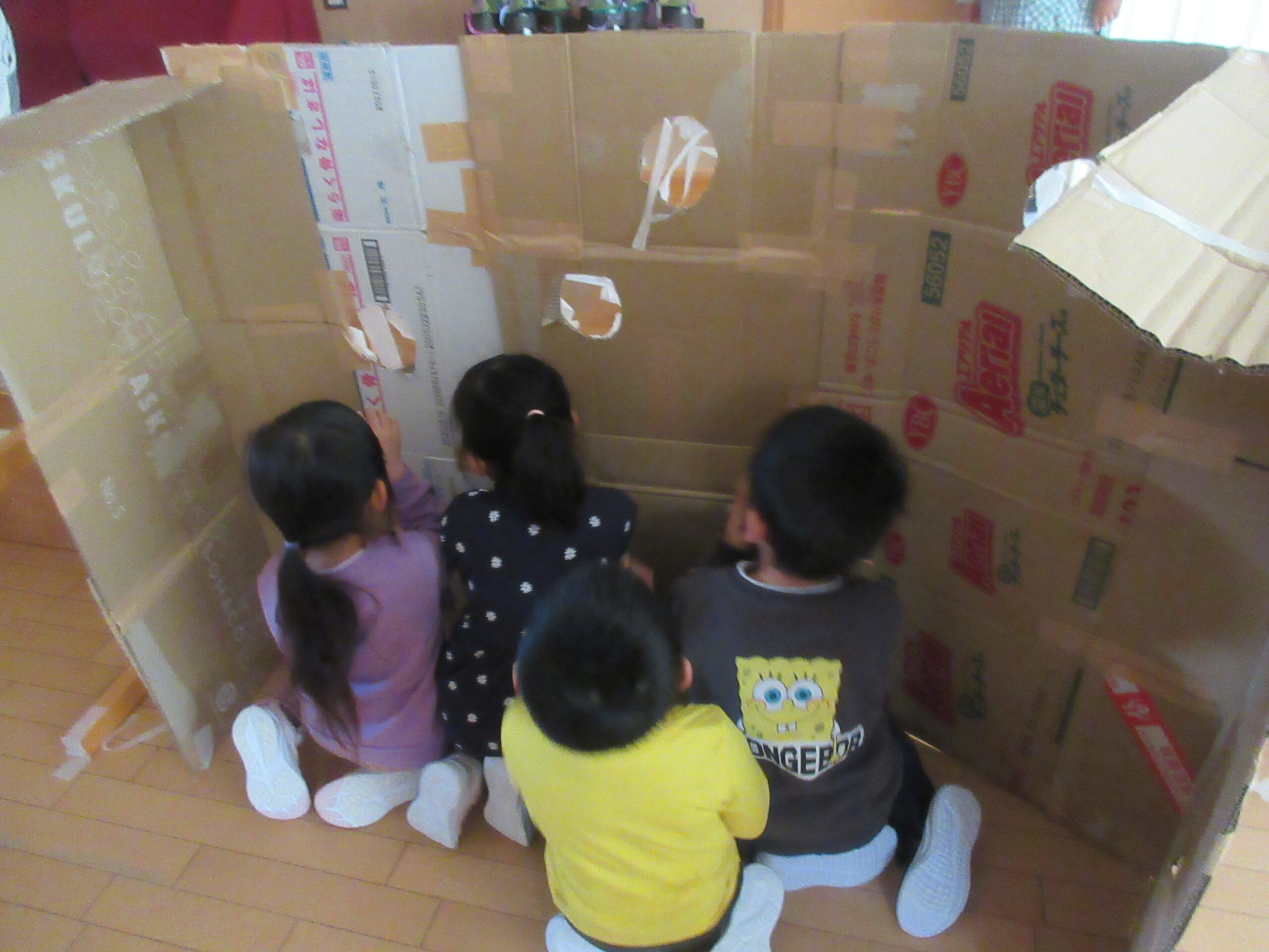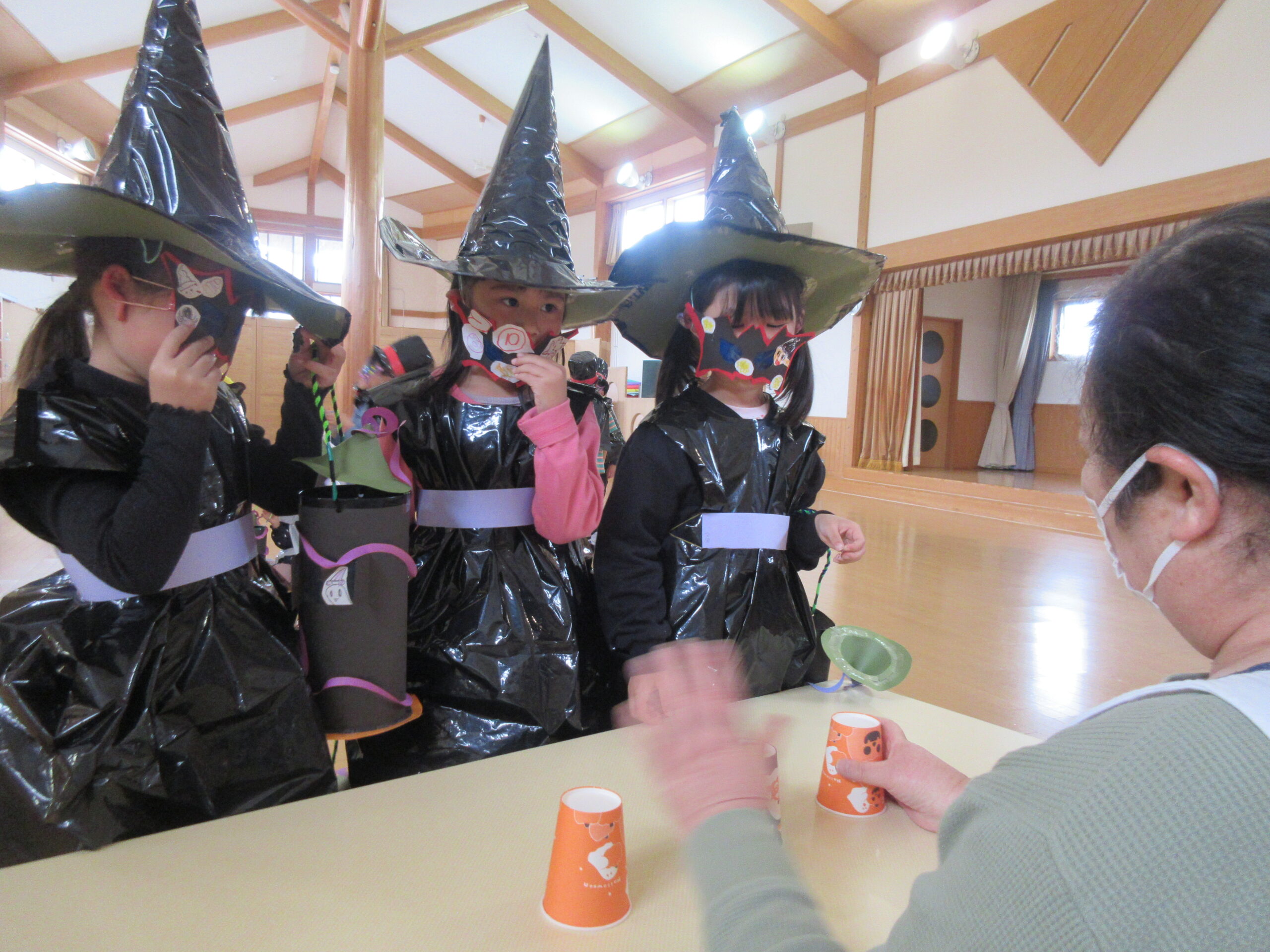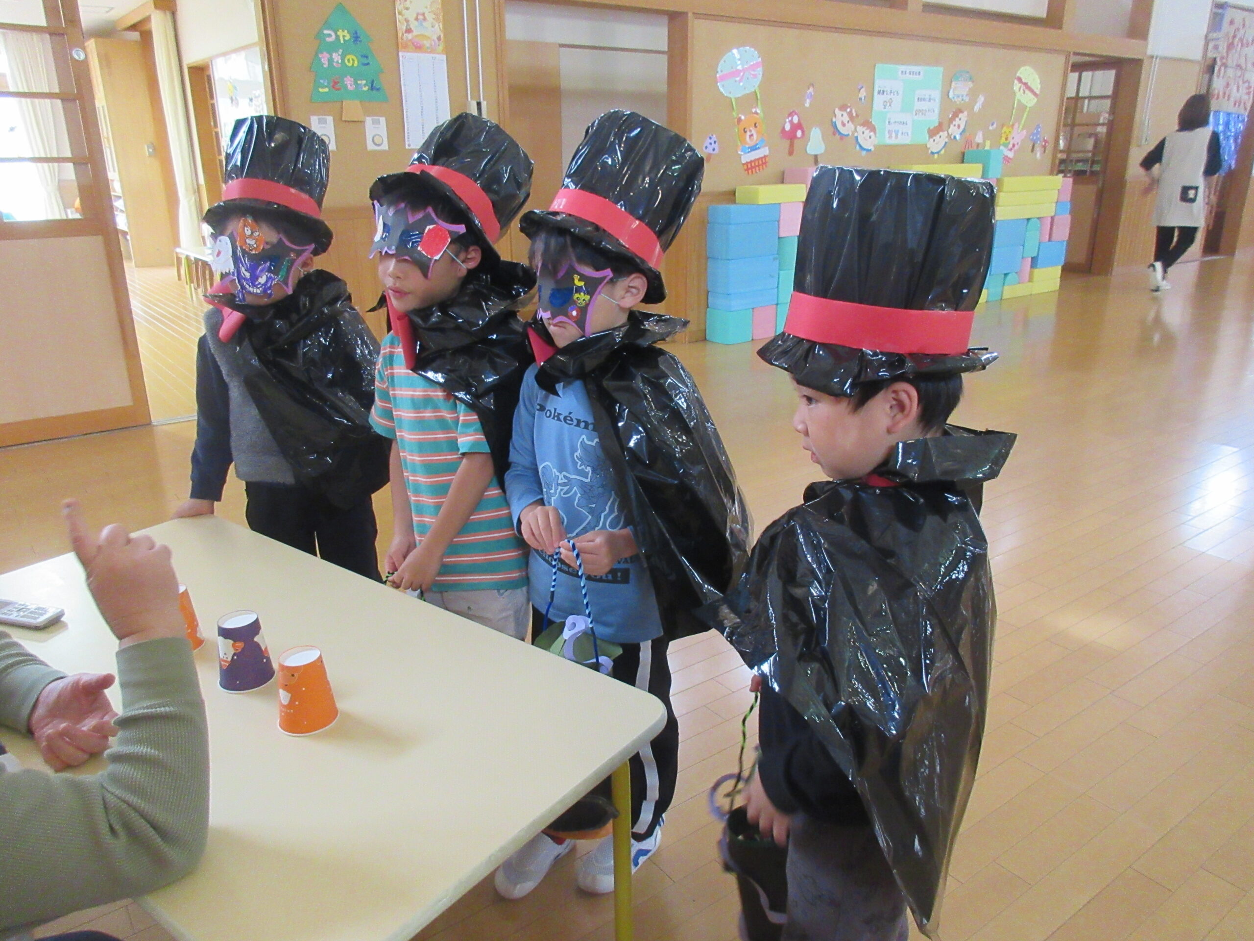 10月最終日のイベント、ハロウィンパーティーをしました。今年は4・5歳児さんが夏に肝試しをしたのをきっかけに「今度は先生たちを驚かせたい」とおばけやしきを計画しました。3歳さんや先生たちを招待しておばけやしきも大成功でした。仮装行列では、自分で作ったおばけに変装して、「トリックオアトリート!!お菓子をくれないといたずらしちゃうぞ。」と合いことばを言って、お菓子や風船をもらいました。