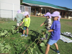 本日、さくら組で畑のさつまいもを掘りました。みんなで力を合わせてつるを引っ張ったり、土の中のいもを一生懸命掘ったりし、さつまいもを手にすると大喜びでした。大、小、いろんな形のおいも全部で98個取れました。