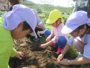 こども園の畑のサツマイモ。大きくなったかな~♪みんなでサツマイモ掘りをしました。「うんとこしょ!どっこいしょ!」とつるを力いっぱい引っ張ったら、尻もちをついて大笑い♪土の中から顔を出したサツマイモを見て「わぁ~!いたぁ!」と大喜び♪ママたちも一生懸命に掘ってくれましたよ。大きなサツマイモがたくさん採れました。ばんざ~い!!採れたおイモはお家にお土産♪おいしい秋を召し上がれ~♡