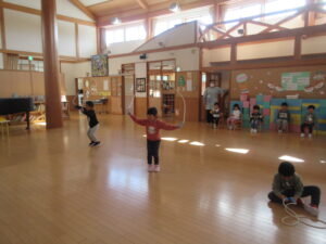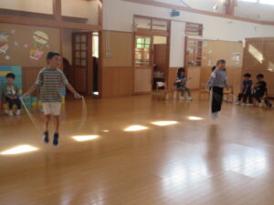 本日、3歳以上児で縄跳び大会を行いました。オープニングは3歳児が長縄に挑戦!飛び越えたり、回している縄をくぐって通り抜けたりしました。4・5歳児は前跳びに挑戦しました。5歳児の1位と2位は100回を超えていました。さくら組・こすもす組みんな一生懸命頑張りました。