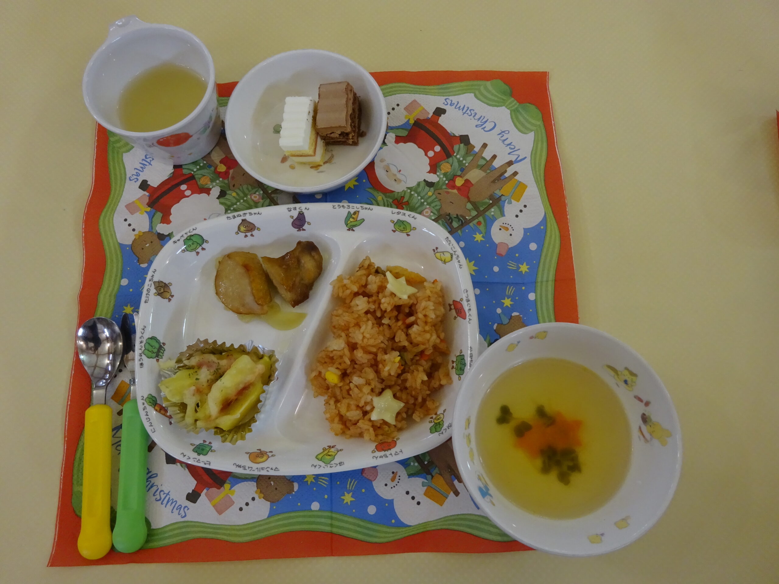 冬休みに入る前に、一足早くクリスマス会を行いました。園長先生のクリスマスのお話しや職員による出し物をみていると、、、リンリンリンと鈴の音が。するとなんと、サンタさんが来てくれました!サンタさんに質問をしたり、プレゼントをもらい大喜び。給食もクリスマスメニューでニコニコでもりもり食べました。
