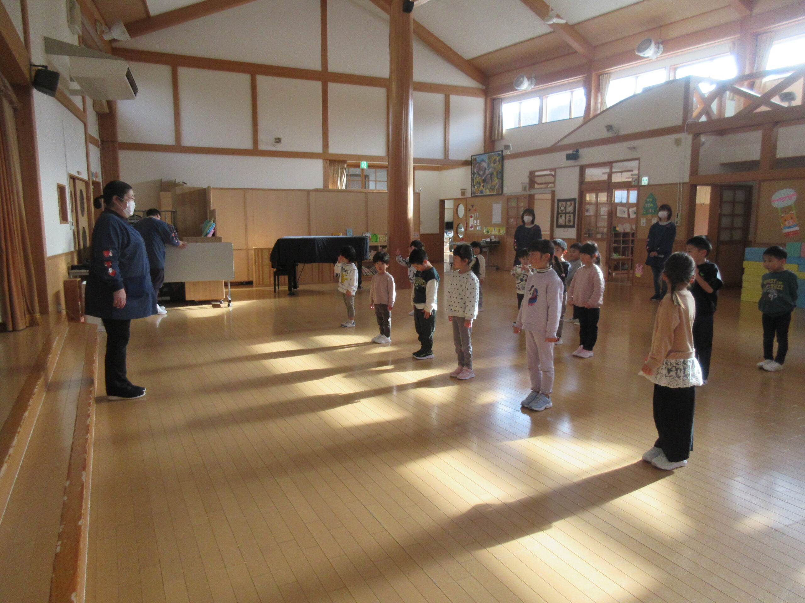 本日、1号認定の友達も冬休みを終え、久しぶりの登園し、3学期の始業式を行いました。5歳児は「冬休みに楽しかったこと」と「3学期頑張りたいこと」を、4歳児は「3学期に頑張りたいこと」をみんなの前で発表してくれました。始業式の後は、久しぶりに友達に会えて嬉しそうに遊ぶ姿が印象的でした。